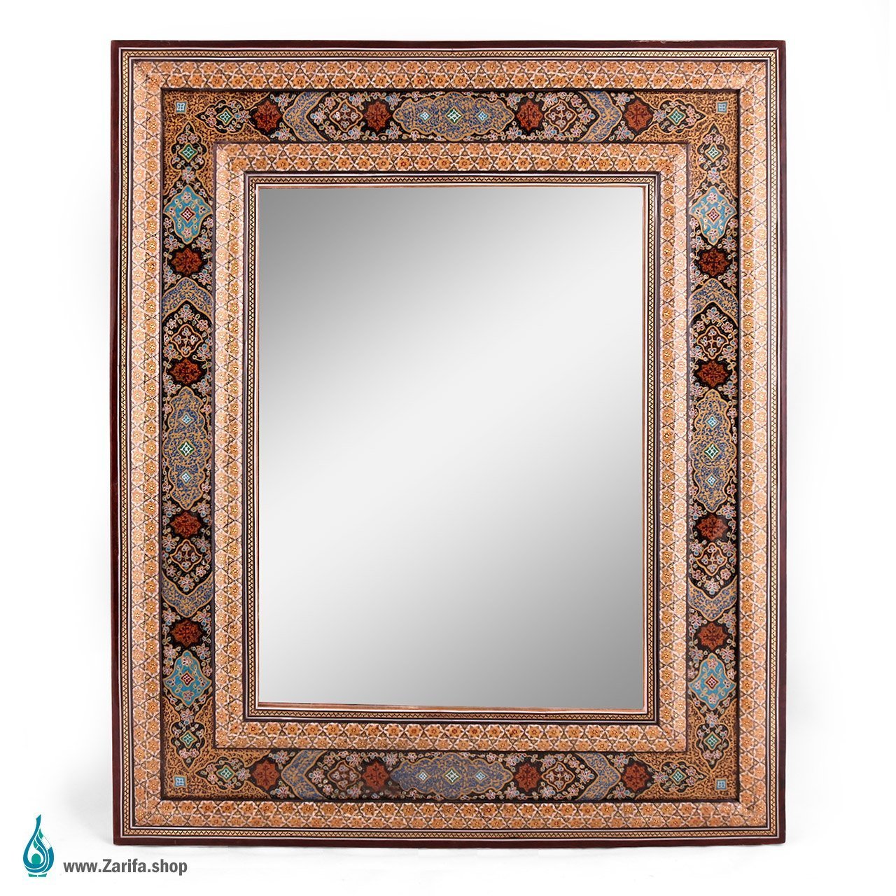 این ست زیبای آینه شمعدان کار هنرمندان اصفهانی است برای اینکه به مذاق هنر دوستان خوش بیاید. آینه قابی مستطیلی دارد و در اصطلاح دوشصتی است. ابعاد آینه 30 در 40 و قاب 50 در 60 هست. . تذهیب زیبایی هماهنگ با خاتم بر روی آن نقاشی شده است و از لاله بزرگ در کنار آینه بهره برده است.