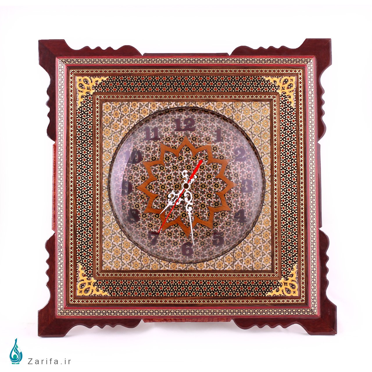ساعت دیواری تمام خاتم محدب تشکیل شده از قاب مربع است که با خاتم کاری زمینه روشن و صفحه دایره داخلی با خاتم متفاوت و اعداد قهوه ای تیره زمینه یک مجموعه بی نظیرتشکیل داده است. یک نقش شمسه چوب دور عقربه ها را فراگرفته است و ترکیب انواع قهوه ای و طلایی در این مجموعه به کمال دیده می شود.این اثر زیبای هنری یکی از زیباترین و شکیل ترین ساعت هایی که می توانید از اصفهان به یادگار ببرید