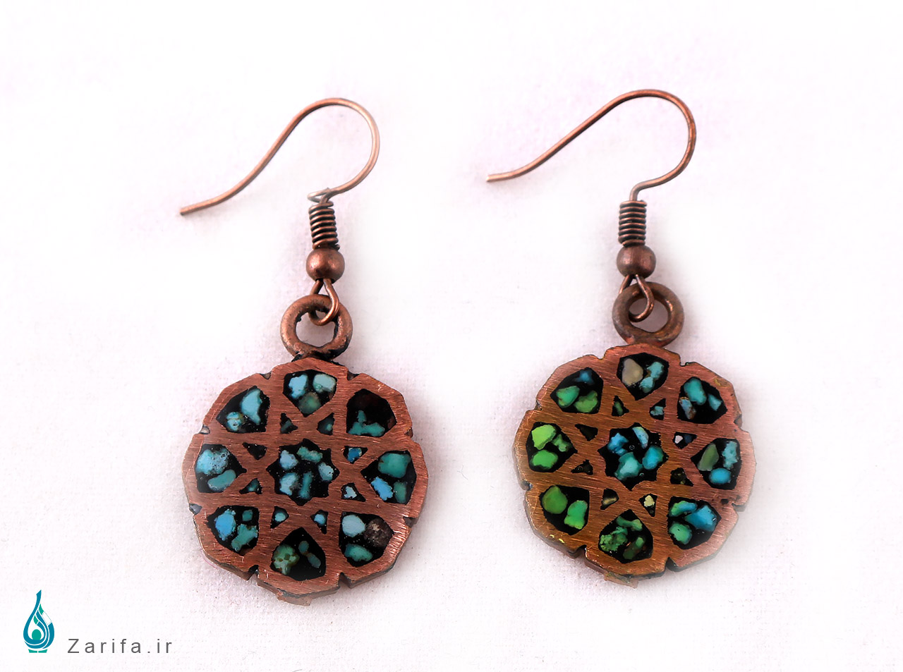 گوشواره فیروزه و مس مشبک از چیدمان فیروزه بر مس حاصل شده و شبکه بندی آن ، زیبای دو چندان به آن بخشیده است.